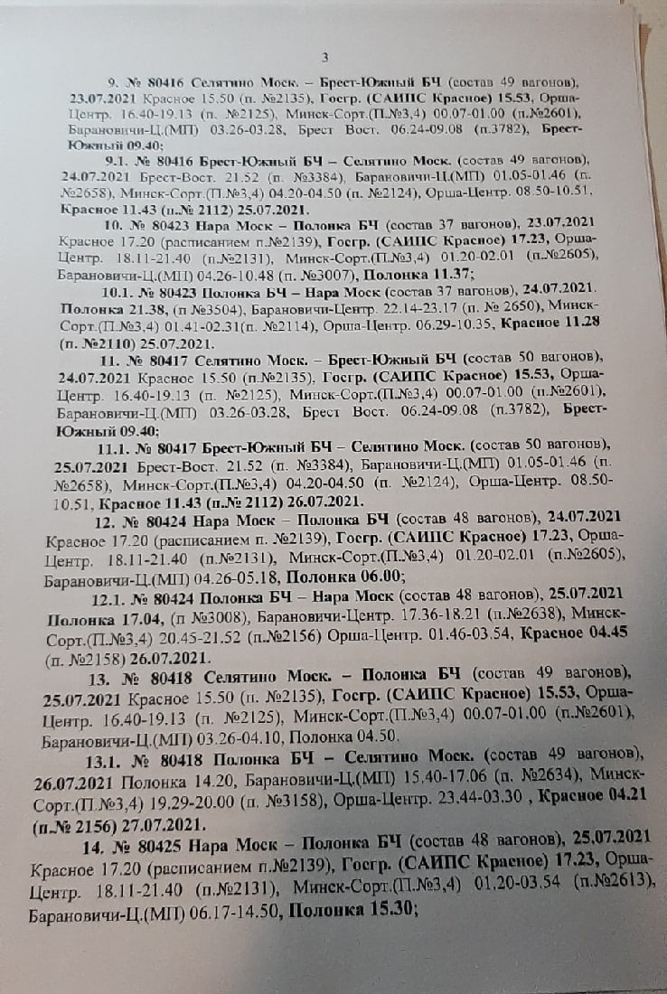 11. № 80417 Селятино Моск. – Брест-Южный БЧ (состав 50 вагонов), 24.07.2021 Красное 15.50 (п.№2135), Госгр. (САИПС Красное) 15.53, Орша-Центр. 16.40-19.13 (п. №2125), Минск-Сорт.(П.№3,4) 00.07-01.00 (п.№2601), Барановичи-Ц.(МП) 03.26-03.28, Брест Вост. 06.24-09.08 (п.3782), Брест-Южный 09.40;