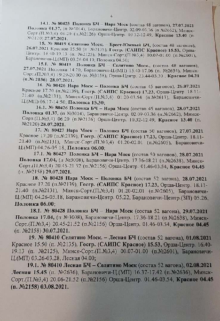 19. № 80410 Селятино Моск. – Лесная БЧ (состав 52 вагона), 01.08.2021 Красное 15.50 (п. №2135), Госгр. (САИПС Красное) 15.53, Орша-Центр. 16.40-19.13 (п. №2125), Минск-Сорт.(П.№3,4) 00.07-01.00 (п.№2601), Барановичи-Ц.(МП) 03.26-03.28, Лесная 04.00;