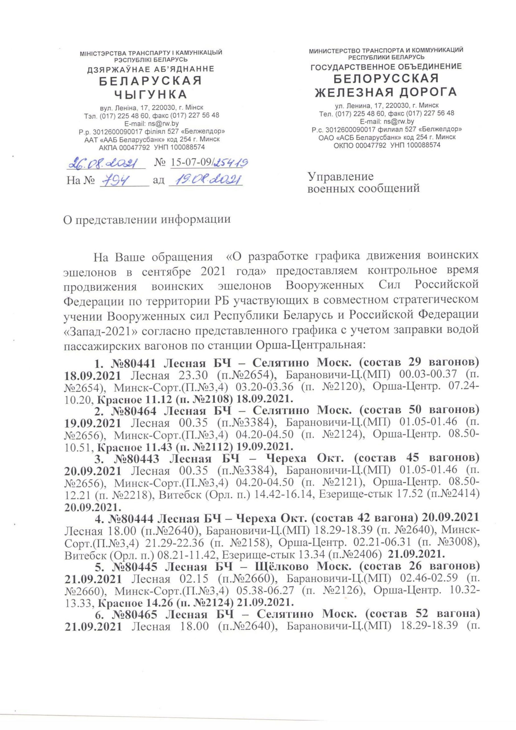 4. №80444 Лесная БЧ – Череха Окт. (состав 42 вагона) 20.09.2021 Лесная 18.00 (п.№2640), Барановичи-Ц.(МП) 18.29-18.39 (п. №2640), Минск-Сорт.(П.№3,4) 21.29-22.36 (п. №2158), Орша-Центр. 02.21-Орша-Зап. 06.31 (п. №3008), Витебск (Орл. п.) 08.21-11.42, Езерище-стык 13.34 (п.№2406) 21.09.2021.