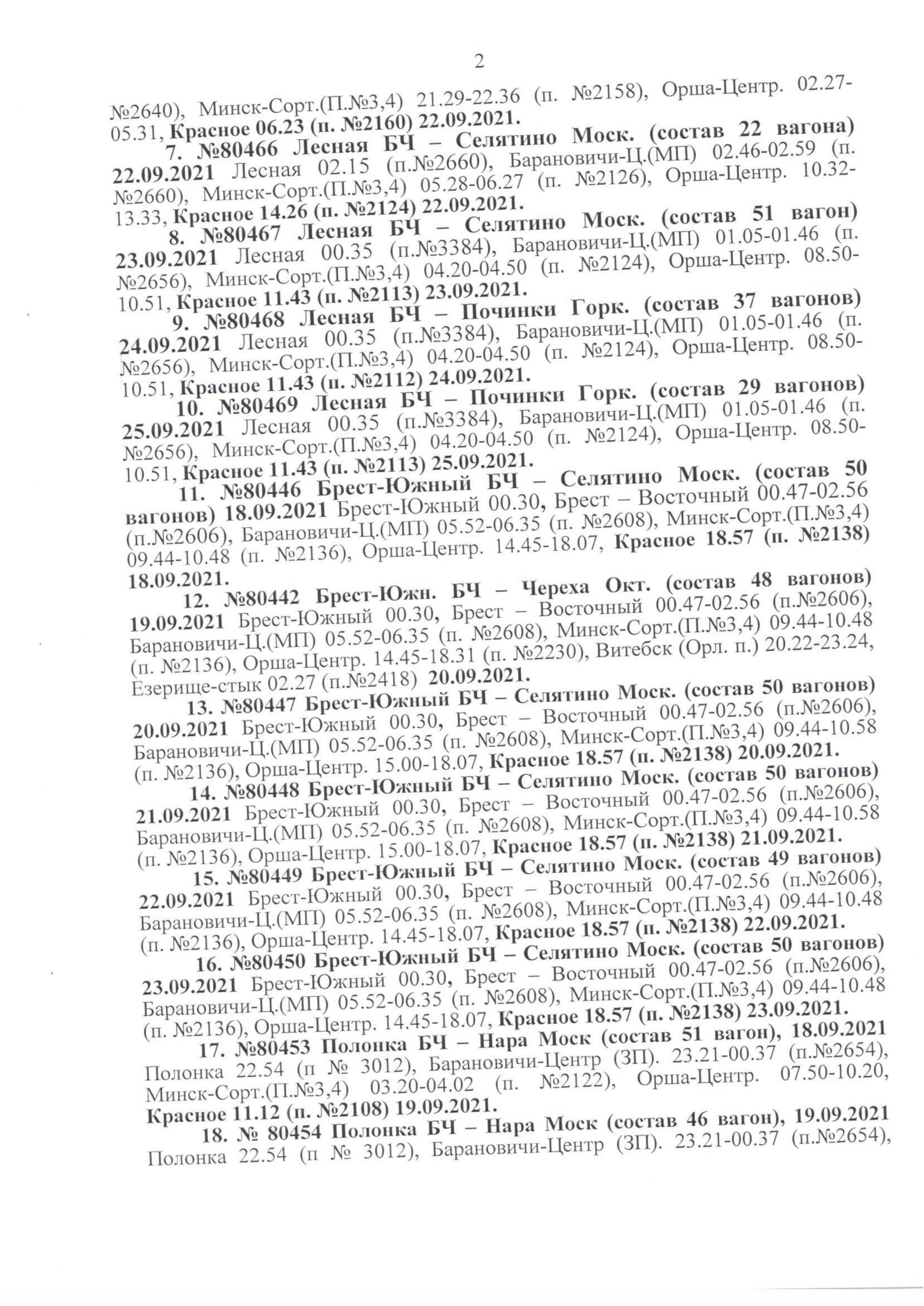 11. №80446 Брест-Южный БЧ – Селятино Моск. (состав 50 вагонов) 18.09.2021 Брест-Южный 00.30, Брест – Восточный 00.47-02.56 (п.№2606), Барановичи-Ц.(МП) 05.52-06.35 (п. №2608), Минск-Сорт.(П.№3,4) 09.44-10.48 (п. №2136), Орша-Центр. 14.45-18.07, Красное 18.57 (п. №2138) 18.09.2021.