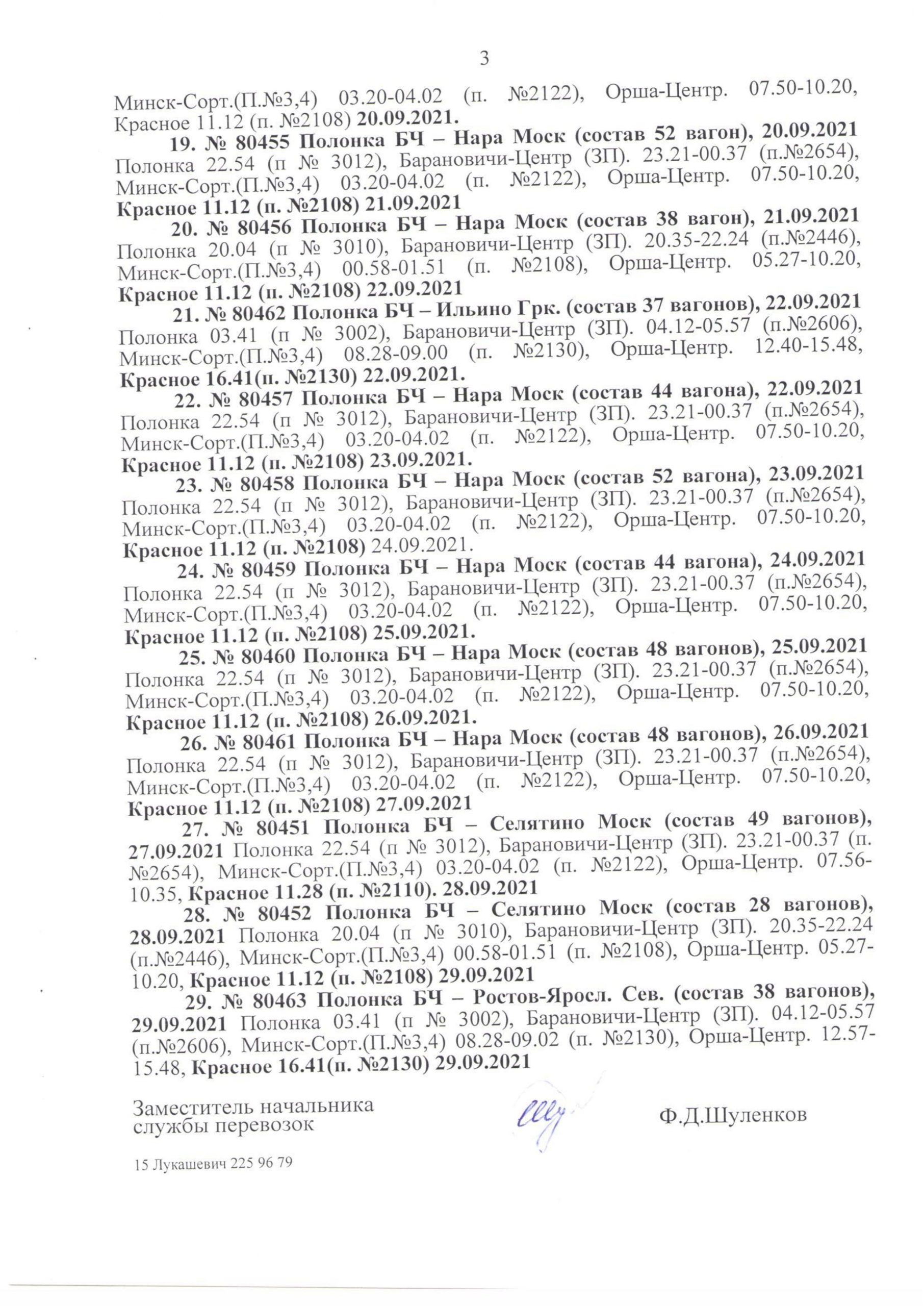 29. № 80463 Полонка БЧ – Ростов-Яросл. Сев. (состав 38 вагонов), 29.09.2021 Полонка 03.41 (п № 3002), Барановичи-Центр (ЗП). 04.12-05.57 (п.№2606), Минск-Сорт.(П.№3,4) 08.28-09.02 (п. №2130), Орша-Центр. 12.57-15.48, Красное 16.41(п. №2130) 29.09.2021