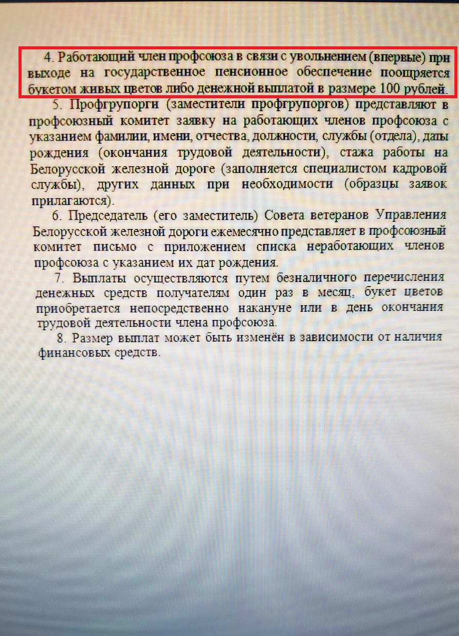 Из недавних изменений в коллективный договор хотелось бы отметить отмену выплат к юбилейным датам 50 и 60 лет в размере должностного оклада и замену на “равноценную” денежную сумму 60 и 100 бел. руб. соответственно. Ну а выбор между букетом цветов или 100 бел. руб. при выходе работника на пенсию вообще можно отнести к разряду тонкой насмешки над ветераном труда —  пенсионером.